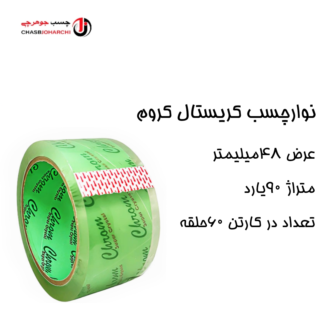 چسب پهن 90 یارد کریستال کروم، انتخابی ایدهآل برای بستهبندی حرفهای و مقاوم! با قدرت چسبندگی مناسب، تمامی نیازهای بستهبندی شما را برآورده میکند. شفافیت کریستالی و مقاومت در برابر فشار، تضمینکننده ایمنی بستههای شماست. همین حالا سفارش دهید و از تخفیف ویژه بهرهمند شوید!